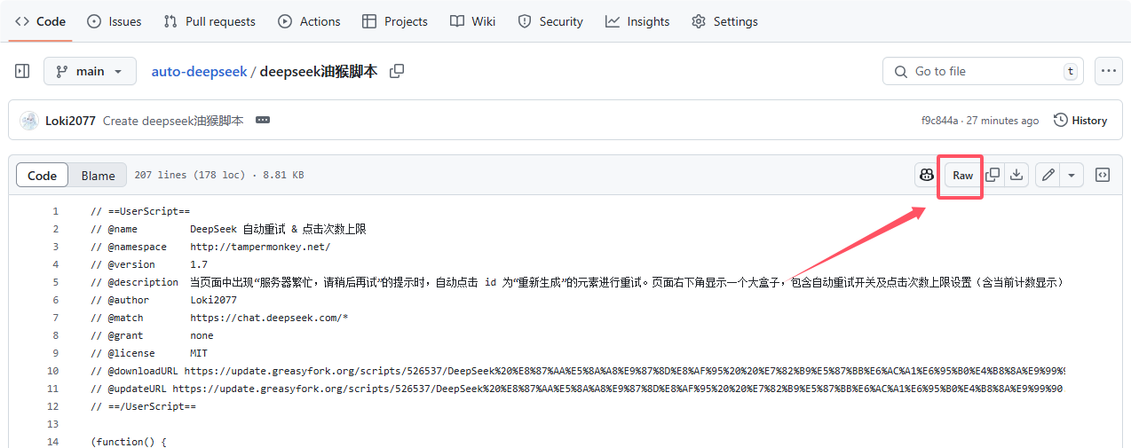 - 点击右上角的raw,复制代码的详细地址(浏览器地址栏)。